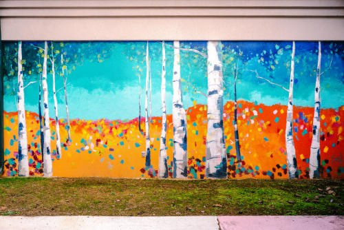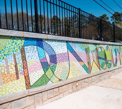 Created by Julie Mazzoni and Jennifer Freeman, The Landscape of Dunwoody Mosaic on Womack Road at Chamblee Dunwoody Road stretches along a retaining wall from a recent improvement project. Spanning 36 feet and varying in height from 3 ½ to 5 feet, it features stained glass, fused glass, and porcelain tile. The design colorfully depicts the city’s name amidst trees, hills, fields, and sky.