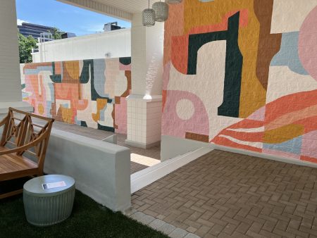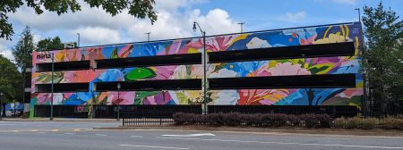 Next, head to the DUNWOODY MARTA STATION on Hammond Drive to see “Flora Chroma” by DAAS on the outside of the parking deck. Scan the QR code for a look at how virtual reality meets public art in this piece. Afterward, loop inside the parking deck to immerse yourself in “The Commuters” mural by Neka King. These murals are beautiful bright pops of art added to the MARTA Station of Dunwoody for commuters and the public to enjoy.